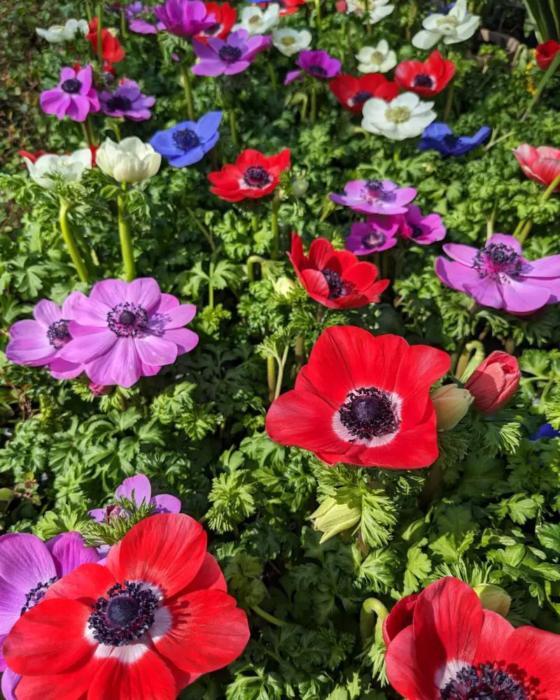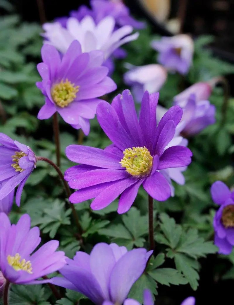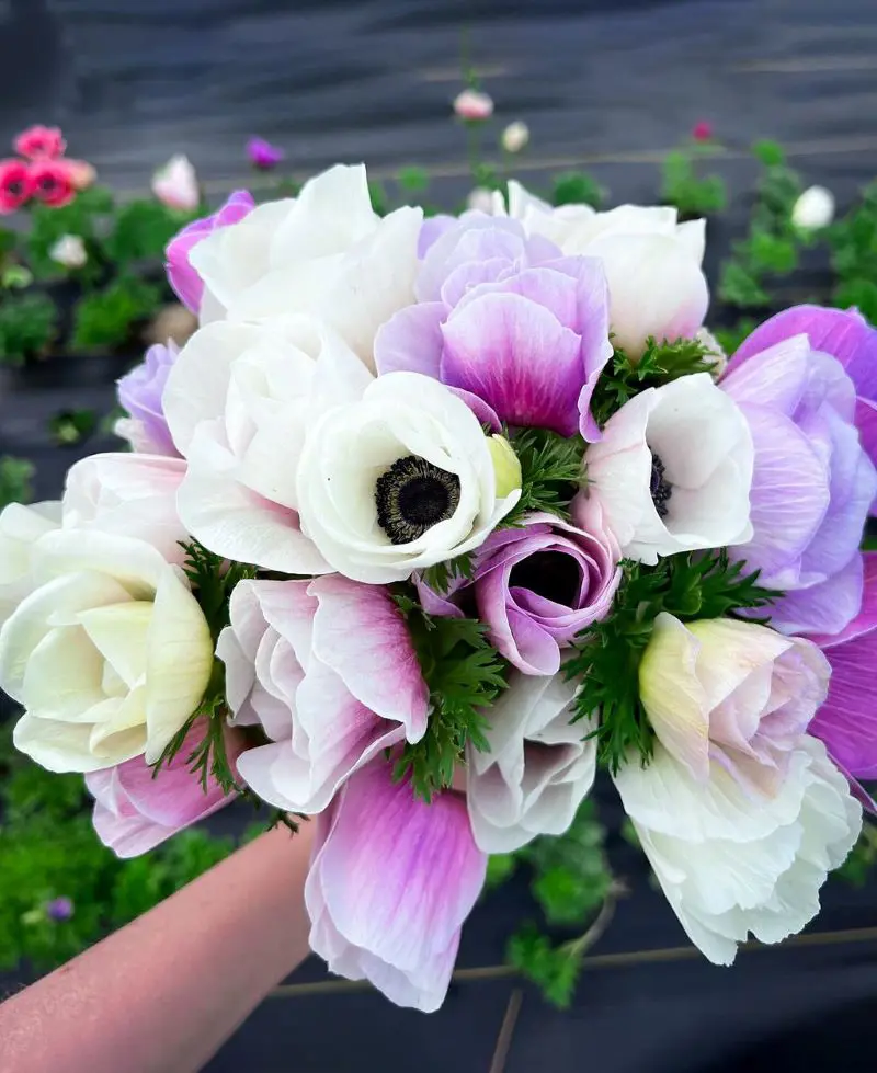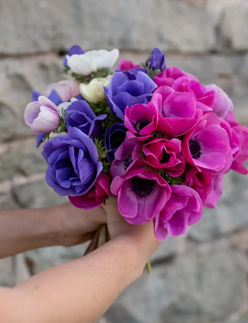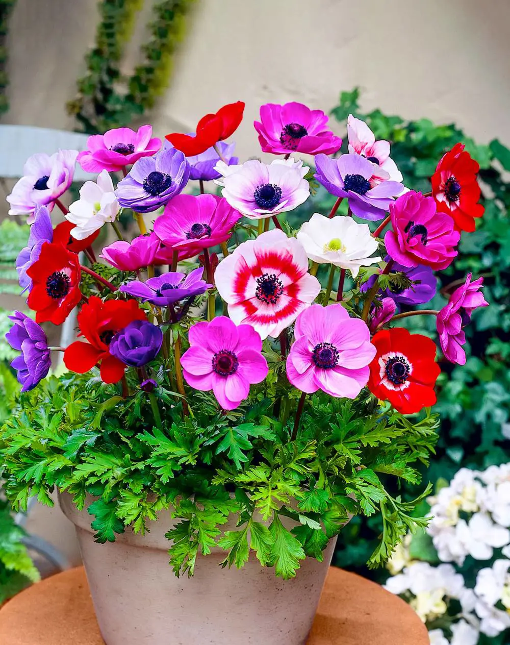 Anemone flowers are renowned for their vibrant and varied appearances, with simple to multi-petaled forms and a wide color range including red, pink, white, blue, purple, and bi-colored varieties. They often feature a contrasting center and fern-like, deeply lobed foliage.