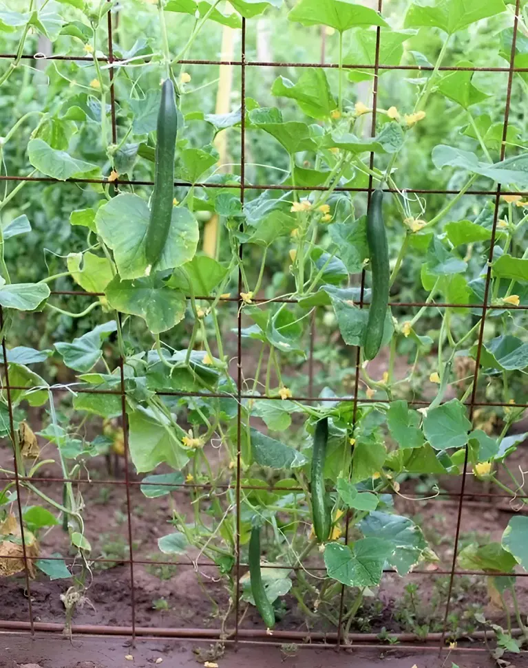 Here, the wire spacing allows for more room for the cucumber vines to climb and spread out. This type of trellis promotes better air circulation around the plants. Additionally, it keeps the cucumbers off the ground reduces the risk of rot, and makes harvesting easier.