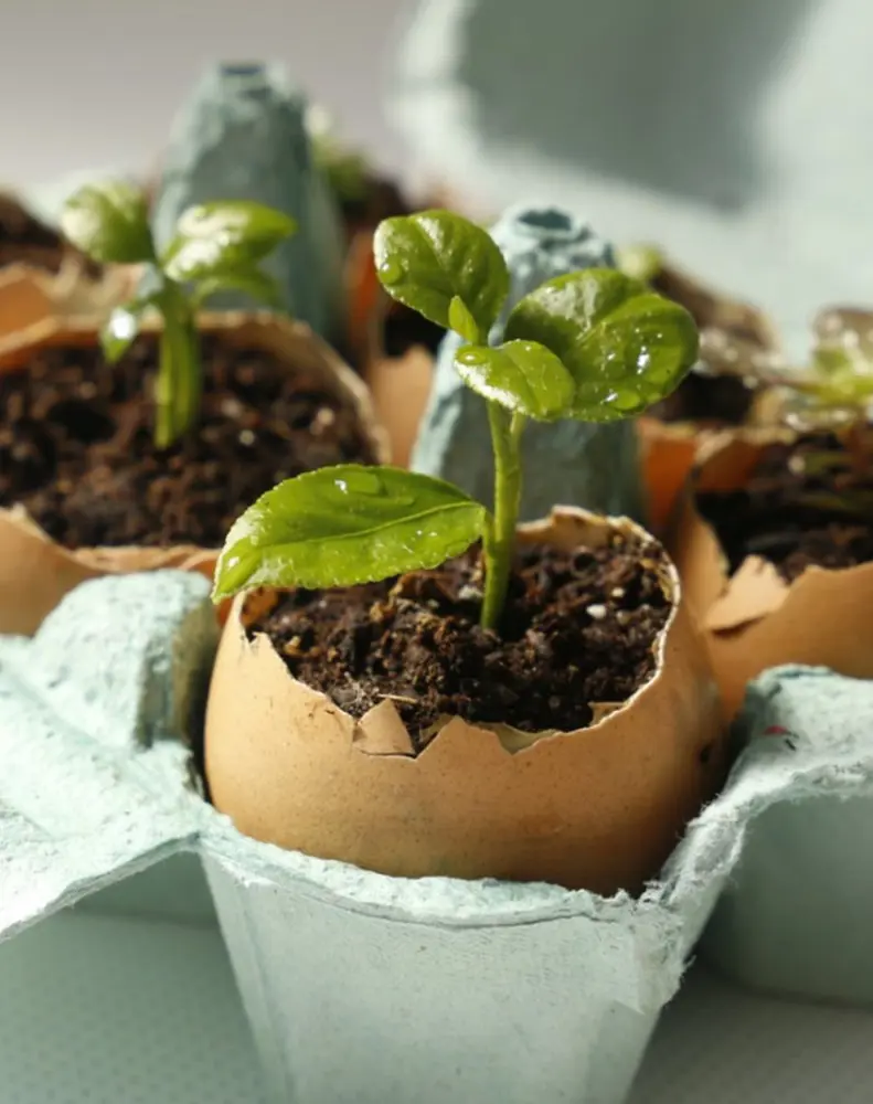 Planting in Eggshells: Fill half an eggshell with potting soil and plant a seed inside. When the seedling is ready to be transplanted, plant the entire eggshell in the garden. The shell will decompose, adding nutrients to the soil.