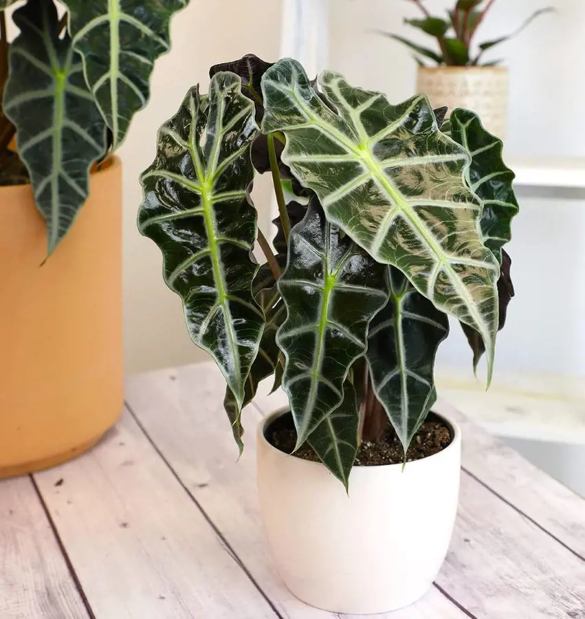 Alocasia amazonica, also known as African Mask Plant, is prized for its striking foliage, featuring dark green leaves with contrasting white or silver veins. It has a compact growth habit, making it well-suited for indoor cultivation.