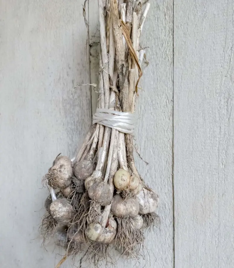 Hang the garlic bunches from sturdy hooks, nails, or a rafter in your drying area.