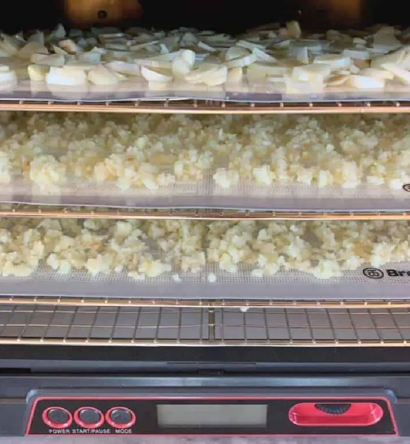 After spreading the garlic, you can air dry or dry them in a dehydrator. Set the dehydrator to a temperature of around 125°F (52°C). This temperature dries the garlic without cooking, preserving its flavor and nutrients. Dry the garlic slices for 8 to 12 hours.