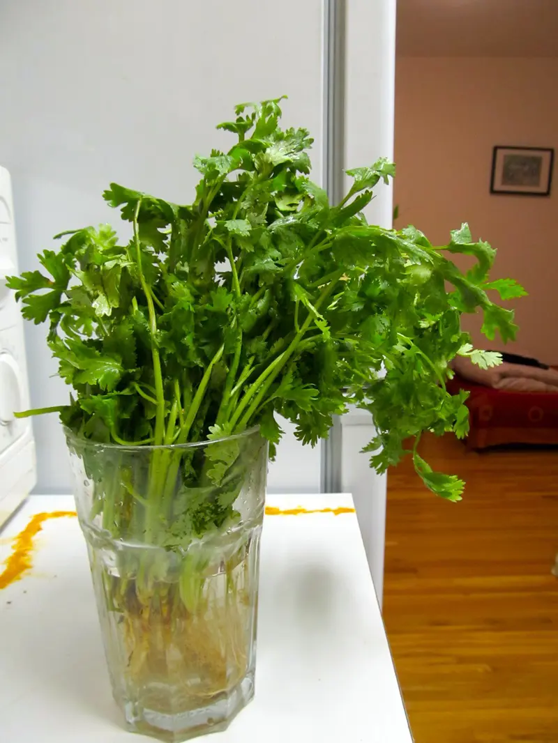 You should remember to treat the cilantro leaves just like the flowers. After placing the leaves in the jar, you need to make sure the leaves are covered loosely with the help of a plastic bag before placing them in the refrigerator for a few days. Keep in mind to change the water every day.
