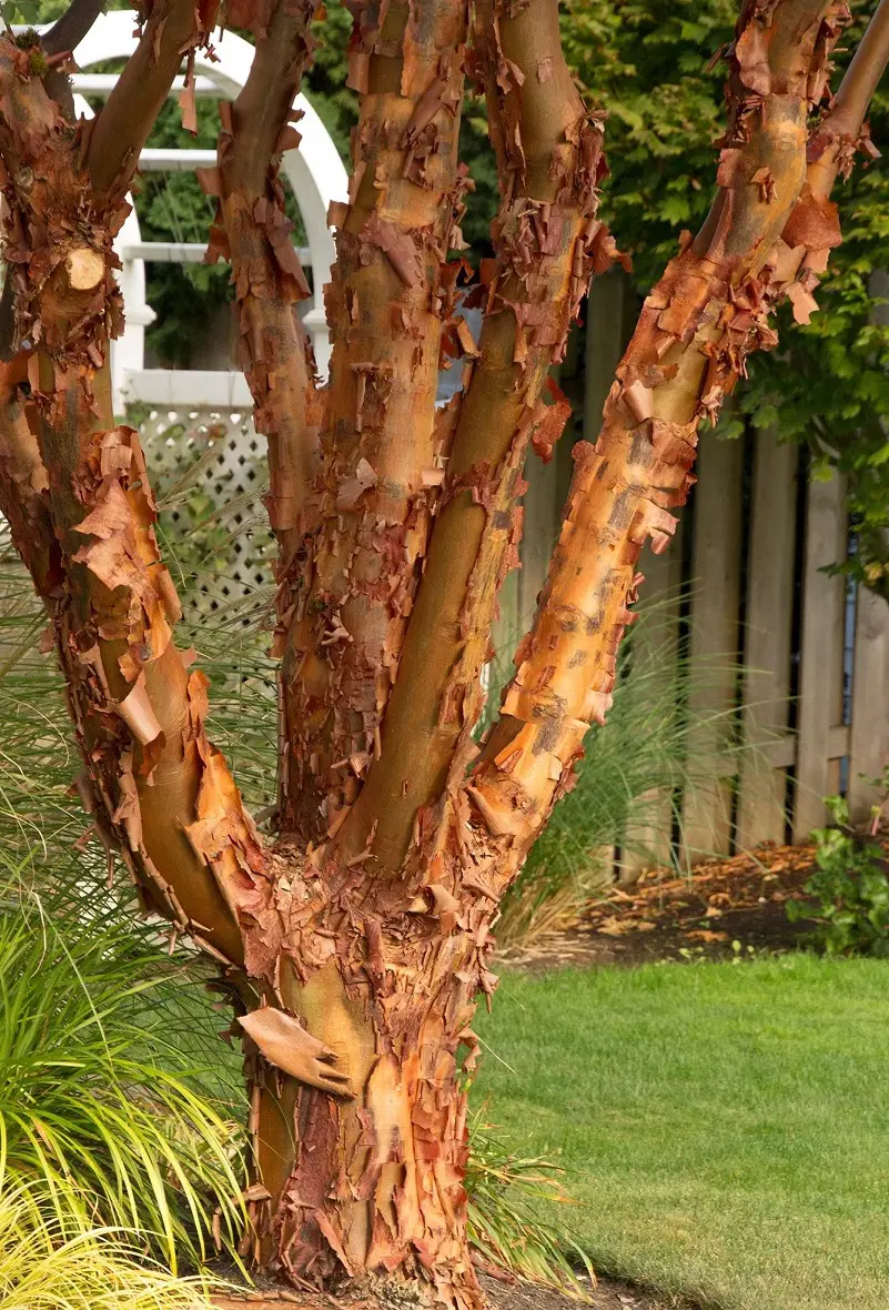 Paperbark maple is known for peeling its cinnamon-colored bark into a thin strip. When the plant matures, the outer bark becomes thick, rough, and inflexible. Thus, the plant peels its outer layer to accommodate the increasing body, which reveals the smooth and lighter inner portion of the tree.