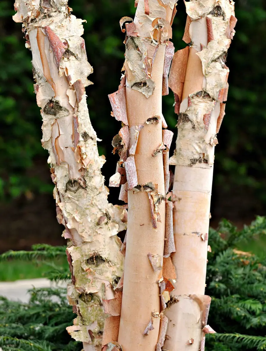 When the birch tree is young, the bark of the tree is smooth with a salmon-pink or reddish-brown color. When the trees mature, the bark starts to peel and curl in a paper-like structure. This exposes the light cream or orange-colored inner trunk of the tree. The bark gradually turns into more darker gray or brown color with more texture as it matures.