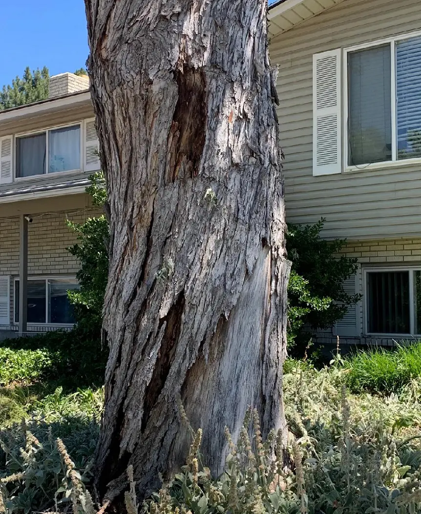 The appealing appearance is given off by the contrast between the softer inner layers and the dark, wrinkled bark, which is enhanced by snow or frost.