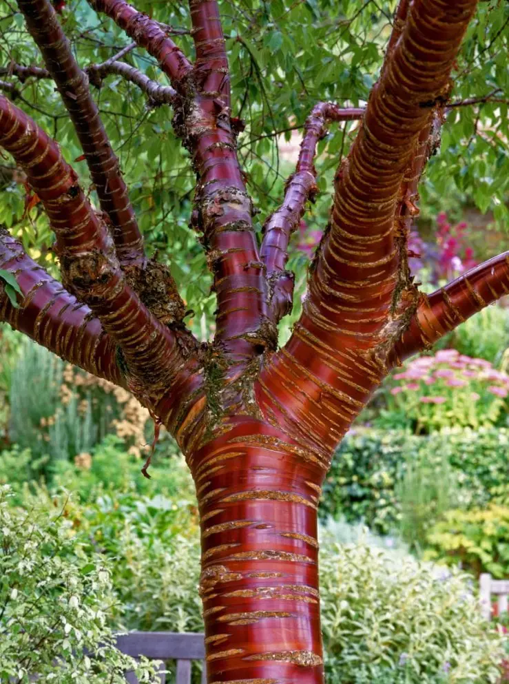 Tibetan cherry has copper-colored bark. The outer bark peels off in small and thin layers between late summer and early fall. This reveals the reddish-brown color of the inner bark.