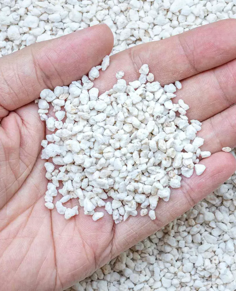 Perlite is primarily composed of silica (SiO2), along with smaller amounts of aluminum oxide (Al2O3), sodium oxide (Na2O), potassium oxide (K2O), iron oxide (Fe2O3), magnesium oxide (MgO), and calcium oxide (CaO). These components are inert and contribute to perlite's beneficial properties for soil improvement.