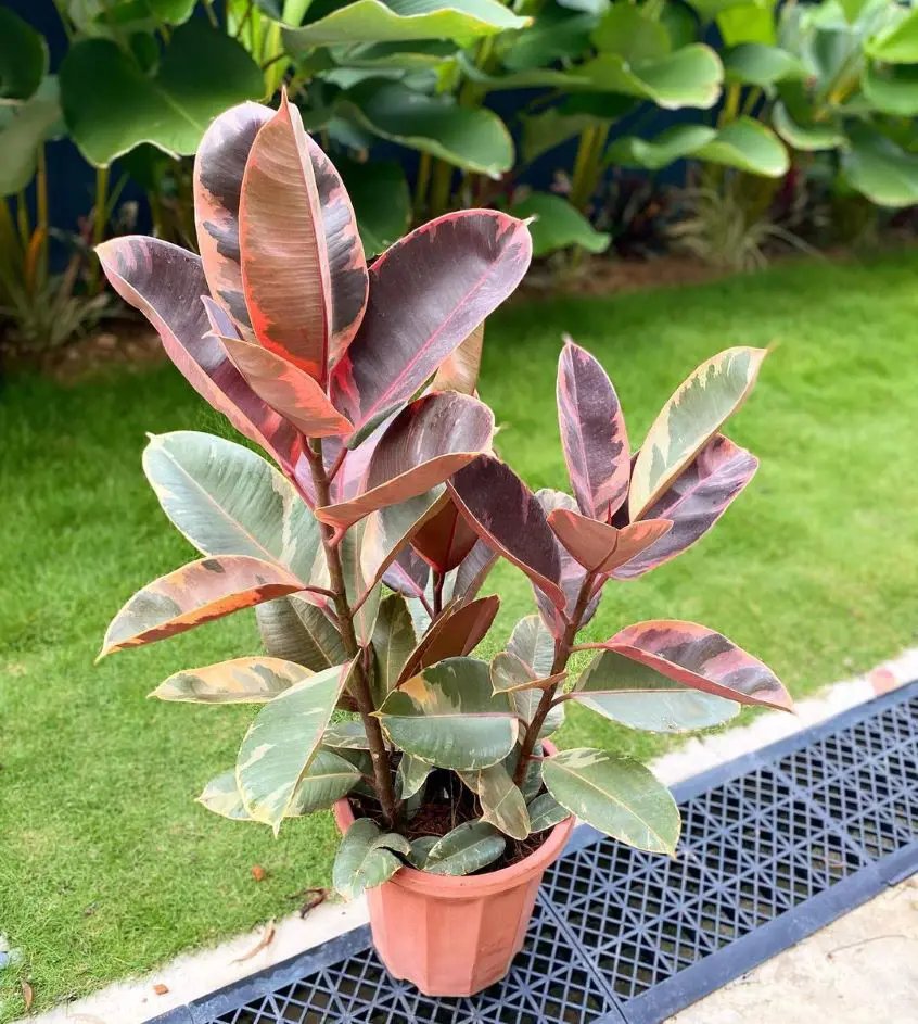 Also known as the Burgundy Rubber Plant, Ficus elastica 'Robusta' is distinguished by its large, glossy leaves with a deep burgundy tint. The color intensifies with age and sunlight exposure, creating a striking contrast against the greenish stems.