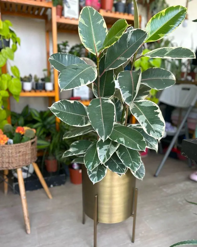 'Tineke' is a variegated variety of the rubber plant, featuring leaves with a blend of green and cream or white stripes. The variegation is random and adds a delightful pattern to the foliage.