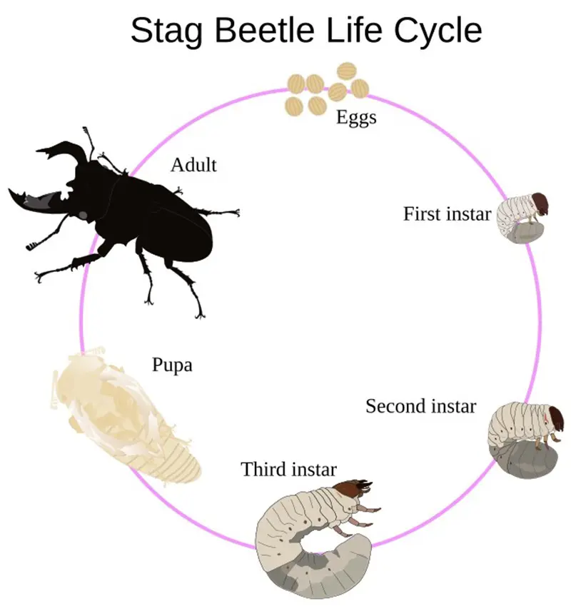 The life of a stag beetle starts as an egg that has been laid usually in the decaying wood by the female beetle. Once they turn into larvae, they are found to spend several years feeding on the decaying wood.