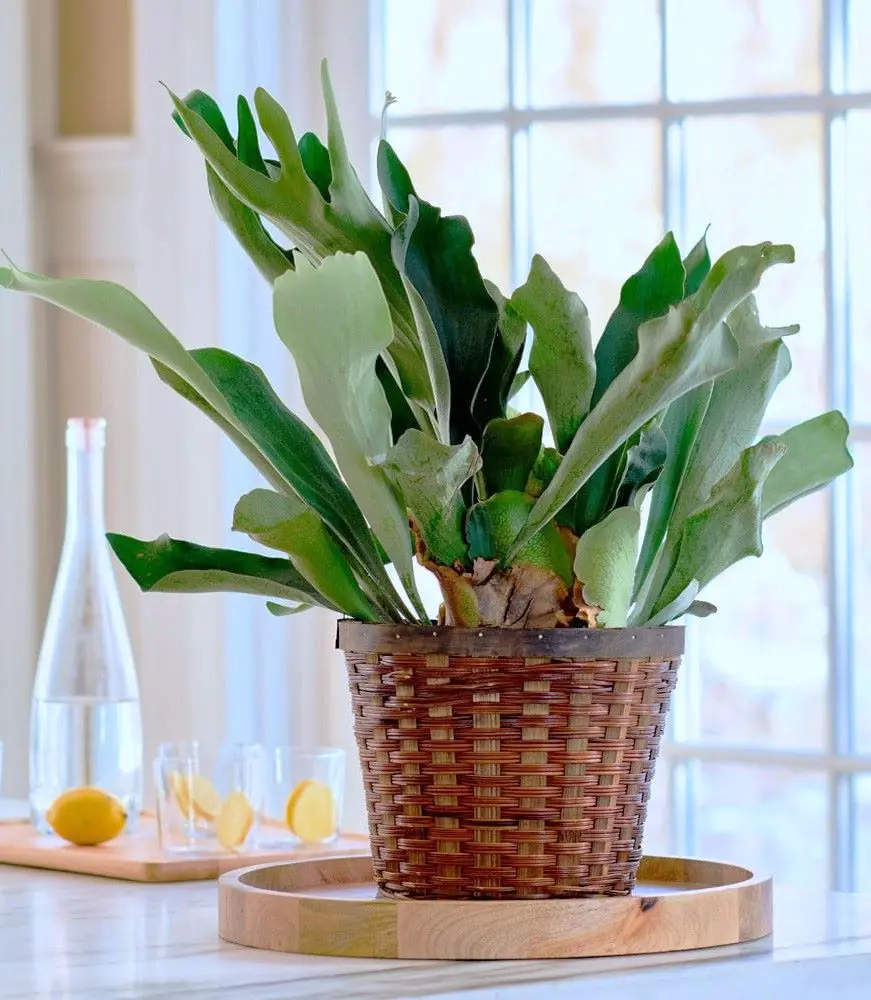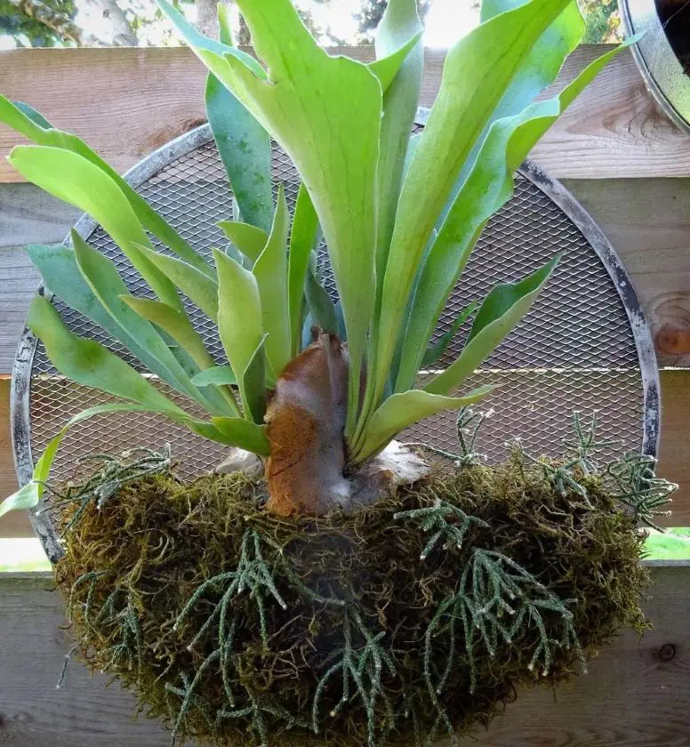 When selecting a container for an indoor staghorn fern, opt for a size that accommodates the plant's root ball with some room to grow. Ensure the container has adequate drainage holes to control waterlogging. Larger baskets, measuring at least 14 inches or even more, are preferable container sizes.